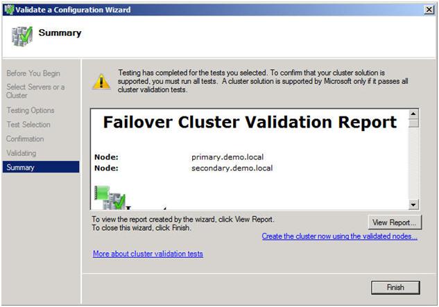 If you have done everything right, you should see a summary page that looks like the following. Notice that the yellow exclamation point indicates that not all of the tests were run. This is to be expected in a multi-site cluster because the storage tests are skipped. As long as everything else checks out OK, you can proceed. If the report indicates any other errors, fix the problem, re-run the tests, and continue.