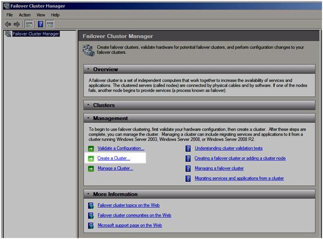 You are now ready to create your cluster. In the Failover Cluster Manager, click on Create a Cluster.
