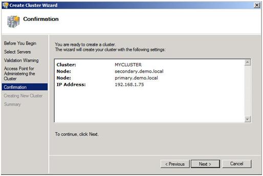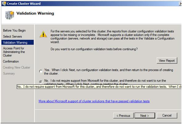 The next step asks whether or not you want to validate your cluster. Since you have already done this you can skip this step. Note this will pose a little bit of a problem later on if installing SQL as it will require that the cluster has passed validation before proceeding. When we get to that point I will show you how to by-pass this check via a command line option in the SQL Server setup. For now, choose No and Next.