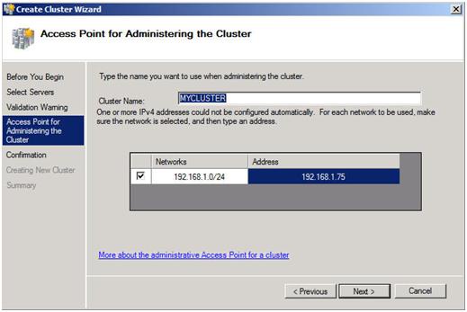 The next step is that you must create a name for this cluster and IP for administering this cluster. This will be the name that you will use to administer the cluster, not the name of the SQL cluster resource which you will create later. Enter a unique name and IP address and click Next.