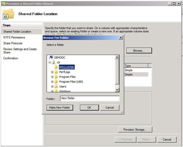 First, we need to identify the server that will hold our File Share witness. Remember, as we discussed earlier, this File Share witness should be located in a 3rd location, accessible by both nodes of the cluster. Once you have identified the server, share a folder as you normally would share a folder. In my case, I create a share called MYCLUSTER on a server named DEMODC.
