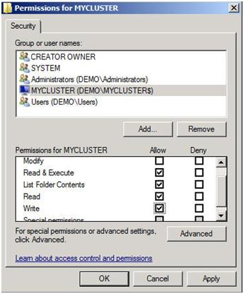 Figure 18 – Give the cluster computer account NTFS permissions