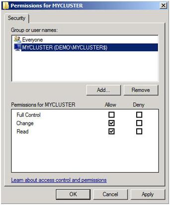 The key thing to remember about this share is that you must give the cluster computer name read/write permissions to the share at both the Share level and NTFS level permissions. If you recall back at Figure 13, I created my cluster and gave it the name “MYCLUSTER”. You will need to make sure you give the cluster computer account read/write permissions as shown in the following screen shots.