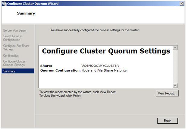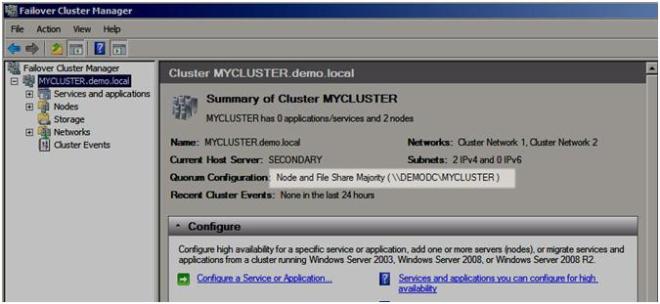 With your redundant communication paths in place, the last thing you need to consider is your quorum model. For a 2-node multi-site cluster configuration, the Microsoft recommended configuration is a Node and File Share Majority quorum. For a detailed description of the quorum types, have a look at this article.