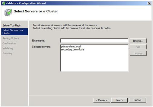 The Validation Wizard launches and presents you the first screen as shown below. Add the two servers in your cluster and click Next to continue.