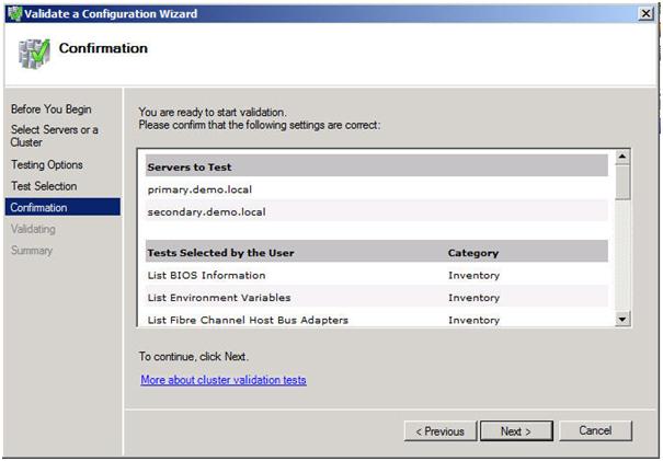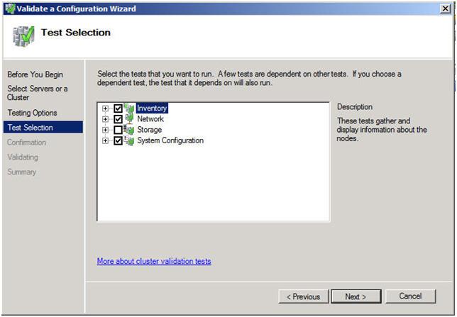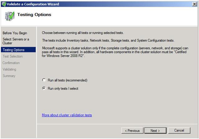 A multi-site cluster does not need to pass the storage validation (see Microsoft article). Toskip the storage validation process,click on “Run only the tests I select” and click Continue.