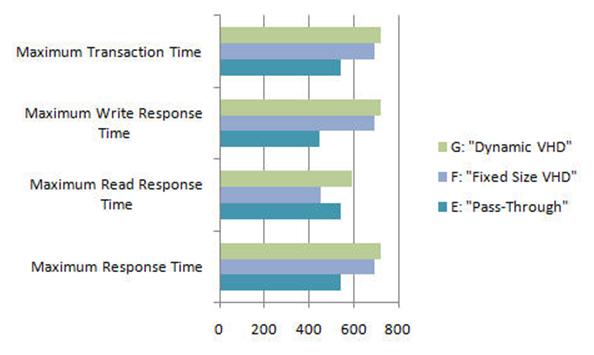 Pass-through disks are another option when configuring a Hyper-V VM. According to my results, the performance of a pass-through disk is marginally better than that of VHD files. However, if you use pass-through disks you lose all of the benefits of VHD files such as portability, snap-shotting and thin provisioning. Considering these trade-offs, using pass-through disks should really only be considered if you require a disk that is greater than 2 TB in size or if your application is I/O bound and you really could benefit from another .1 ms shaved off your average response time.
