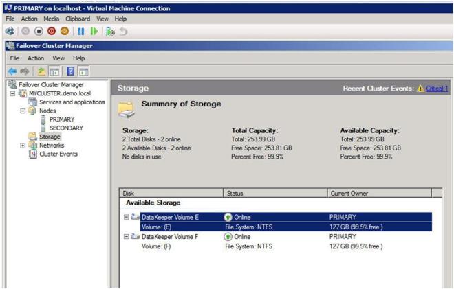 Deploying a multi-site cluster will require that you work very closely with your replication vendor during this part of the configuration. Each vendor will have very specific instructions on how to set up the replication and create the storage resources to be used in your cluster. For the purposes of this demonstration, I will use SteelEye DataKeeper Cluster Edition to replicate the E drive from the server named PRIMARY to the server named SECONDARY. The E drive on PRIMARY and SECONDARY are just local attached volumes and not part of any SAN. As long as the E drive shows up as a local attached disk, DataKeeper can replicate it from one server to another. You can mix and match SAS, iSCSI, SAN, VHD, or any other storage type as DataKeeper is storage agnostic.
