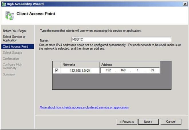 Give the MSDTC resource a name and unique IP address. These should be unique to MSDTC and not the same as you will use later when you create your SQL resource.