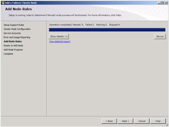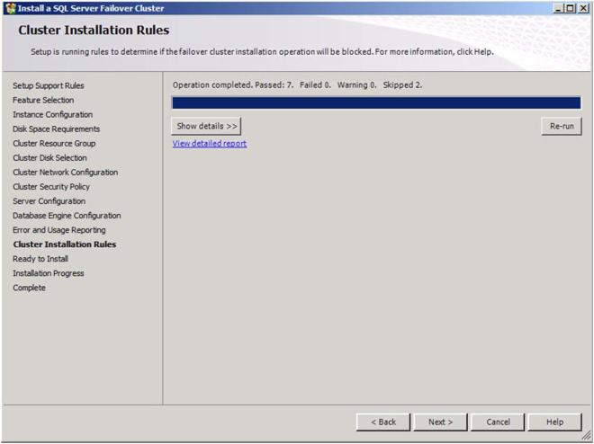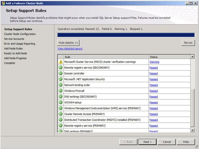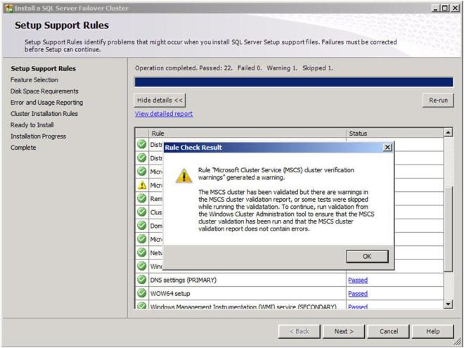 At the end of the Setup for the Support Files you will receive a warning. Click on Show details and you will see the message below. You can click Next, ignoring this message since it is expected in a multi-site or non-shared storage cluster.