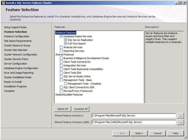 Choose the features you would like to install and click Next. Leave the “Shared Feature” directory set to the C drive as the SQL binaries should not be installed on the replicated volume.