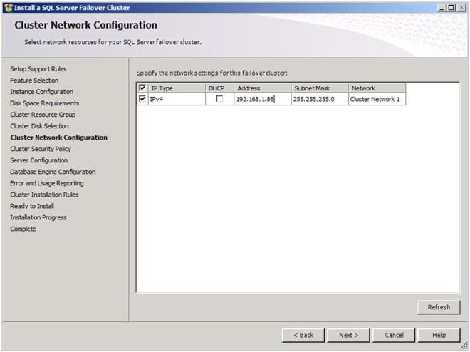 Now you will choose the IP address you want associated with the SQL cluster resource. You could leave it set to use DHCP if you wish.