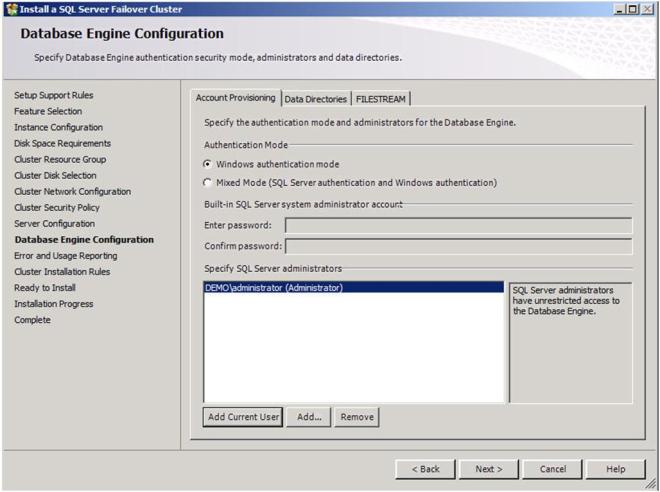 Add any SQL Server administrators and choose your authentication mode and then click Next
