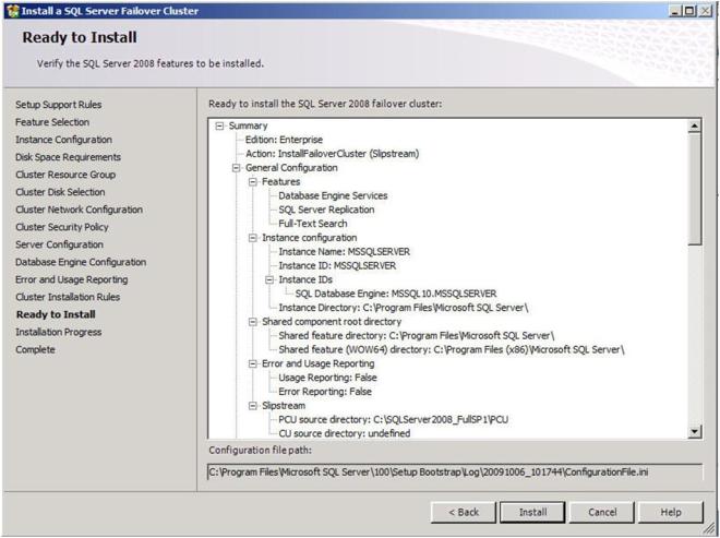 I followed the instructions detailed in the first article and copied my SQL 2008 with SP1 install to the C:\ drive of both nodes in my cluster. In the instructions below, I will do the installation from the local disk of each cluster node.