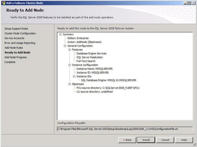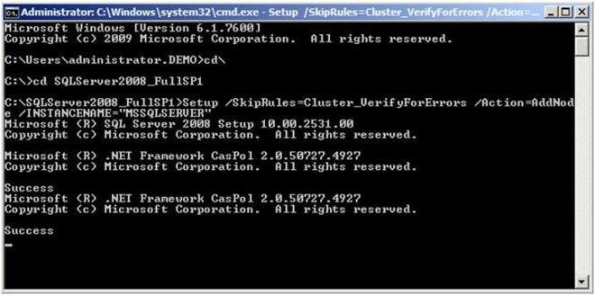 Install SQL 2008 SP1 (merged setup) on the 2nd node using the following command: