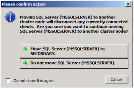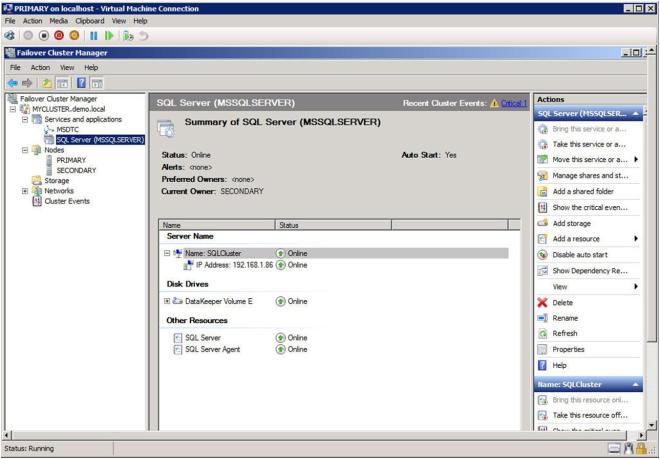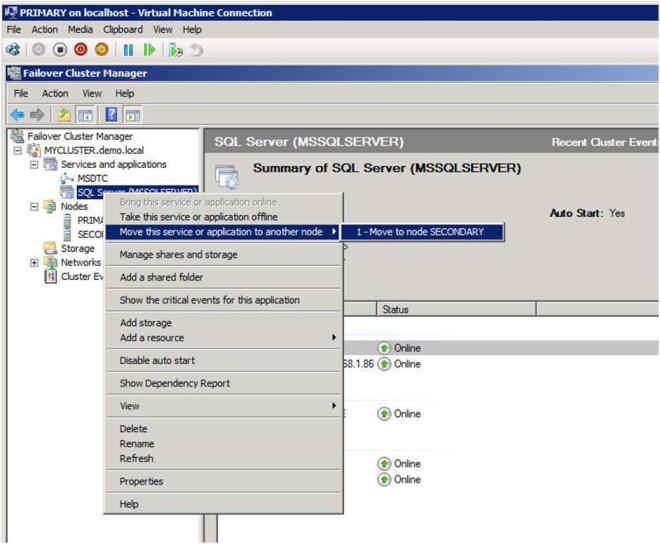 Now that you have a fully functional two node cluster, you probably should testing things out by doing some manual switchovers. Right click on the resource and choose “Move to node SECONDARY”.