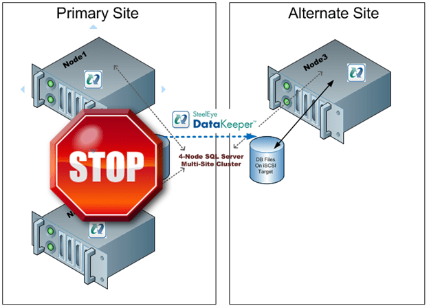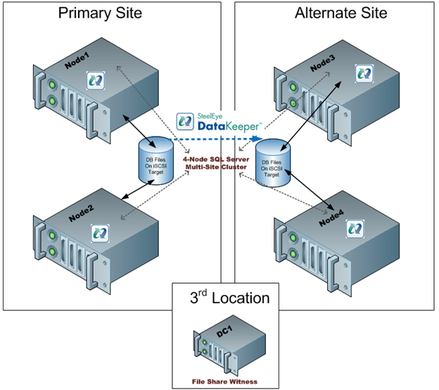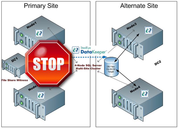 Figure 4 – with the file share witness in a 3rd location failover will occur if the Primary Site is lost and false failovers are avoided in the case of connectivity failure between the Primary and Alternate Site.