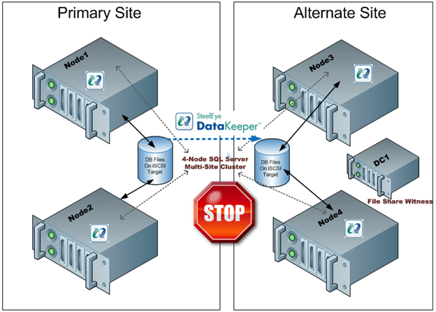 The only “safe” way to have automatic failover in a multisite cluster is to have an equal number of nodes in each site and to have a file share witness in a 3rd location with connectivity back to both the primary site and the DR site. This concept is a little difficult to grasp at first, so let me attempt to explain through illustrations.