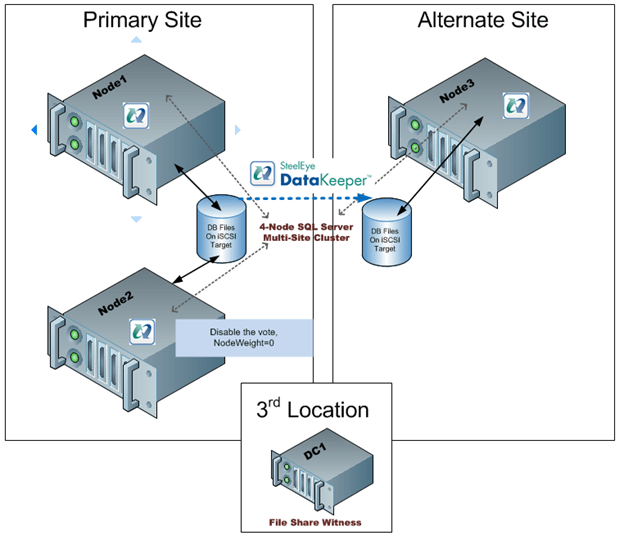 Figure 5 – by disabling the vote on Node2 you can deploy a 3-node multisite cluster with a file share witness and safely support automatic failover to the DR site. The same concept can be applied to any cluster with an odd number of nodes.