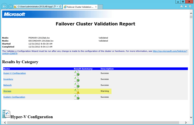 - Assuming you cluster “passed” validation you should have a report that looks similar to mine. You will notice that my report contains “warnings” but no errors. It is important for you to view the report and understand what warnings might be present, but you as long as you understand the warnings and they make sense for your particular environment you can move on. If you validation “failed”, you MUST fix the failures before moving on. Click View Report to view the report