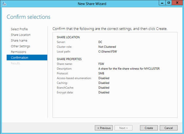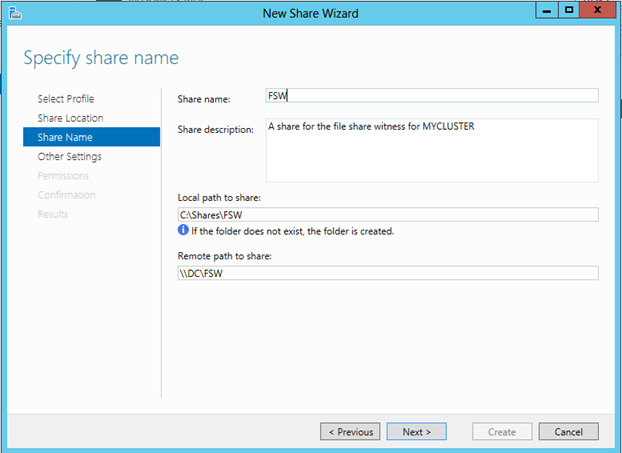 - A File Share Witness needs to be configured on a server that is not part of the cluster. A file share witness is a basic file share that the cluster computer name (MYCLUSTER in our case) has read/write access. The first step involves creating this file share. In our example, we are going to create a file share on our DC and give MYCLUSTER read/write access to it.