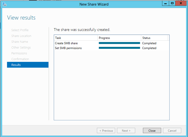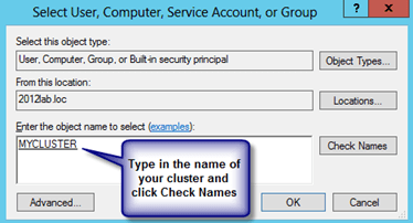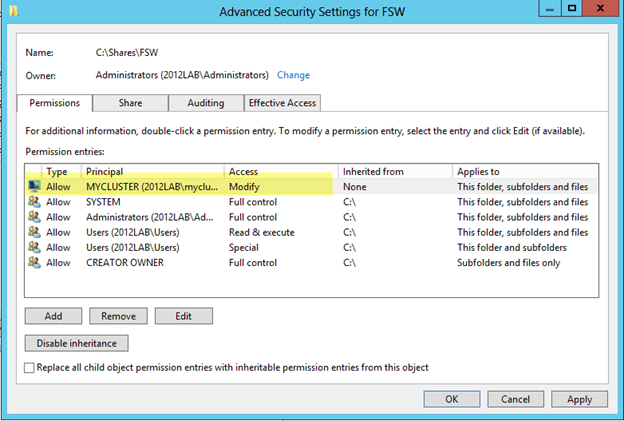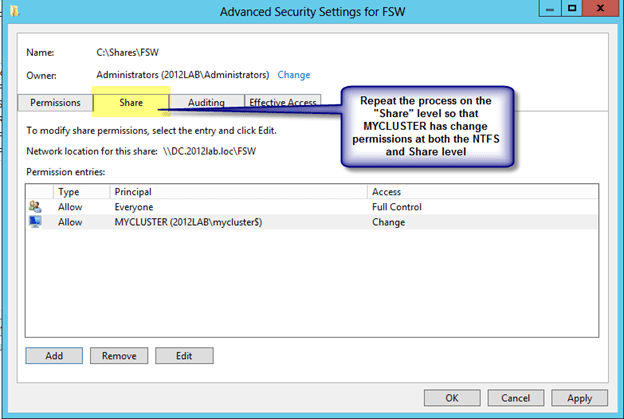 The file share does not need to reside on a Windows 2012 server, but it does need to be on a Windows Server in the same domain as the cluster. The important thing to remember is that the cluster computer name that we created needs read/write access at both the share level and NTFS level. The following are some screen shots that walk you through this process on the DC server which is running Windows Server 2012 in my lab.