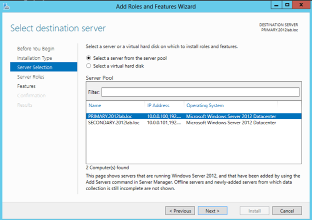 Choose the server on which you wish to enable the failover cluster feature