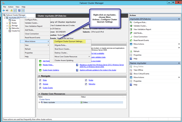 - Now that we have the file share created on DC, we will go back to PRIMARY and use the Failover Cluster Manager to change the quorum type as shown in the following steps.