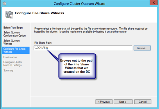 If by chance this wizard fails, it is most likely related to the permissions on the file share. Make sure you give the cluster computer name read/write permissions at BOTH the file share and security (NTFS) level and try again.