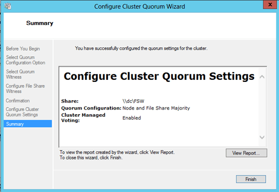 - After you click next you will see that the cluster has finished the creation process, but there may be some warnings. In our case the warnings are probably related to the quorum configuration which we will take care of in the next step. Click View Report to check out any warnings.