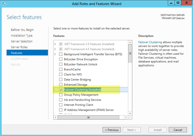 - On the Features page select Failover Clustering and click Next and then confirm the installation