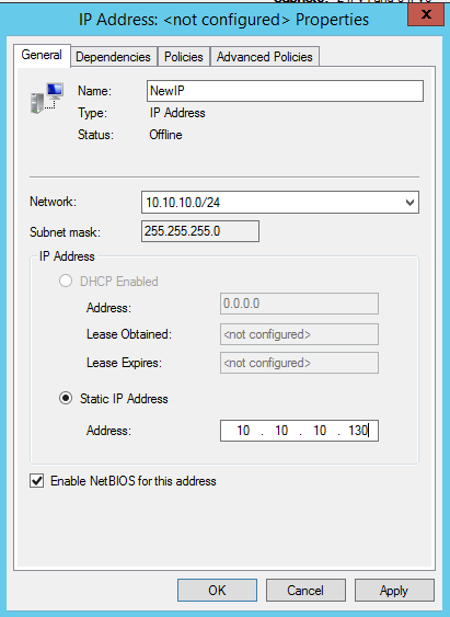 In order to fix this, we will need to go into the properties of the IP Address resource and change the address to another address in the same subnet that is not currently in use. I would select an address that is at the higher end of the subnet range in order to reduce the possibility that in the future you might deploy a new VM and Azure will hand out that cluster IP address, causing an IP address conflict. In order to eliminate this possibility, Microsoft will have to allow us more control over the DHCP address pool. For now, the only way to completely eliminate that possibility is to create a new subnet in the Virtual Private Network for any new VMs that you might deploy later, so only this cluster resides in this subnet. If you DO plan to deploy more VMs in this subnet, you might as well deploy them all at the same time so you know which IP addresses they will use, that way you can use whatever IP addresses are left of for the cluster(s).