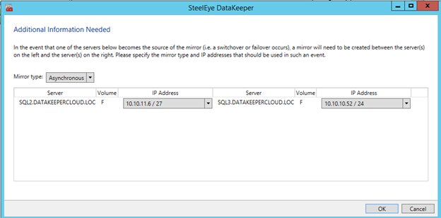Choose the source of the mirror. When you choose the IP Address for the source and target, be sure to choose IP address of the server itself, DO NOT CHOOSE THE CLUSTER IP ADDRESS!