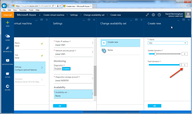 If you have been following along, up until now when you created an Availability Set the default option was to create two Fault Domains per Availability Set. When deploying a cluster, it is important to have a minimum of three Fault Domains, one for each cluster node and one for your File Share Witness. This ensures that a failure of a single fault domain never impacts more than one of your quorum votes at any given time. Before this feature was implemented in the GUI there was a way to do it through an ARM Template, but putting it in the GUI makes it easy for those administrators not quite up to speed on ARM templates.