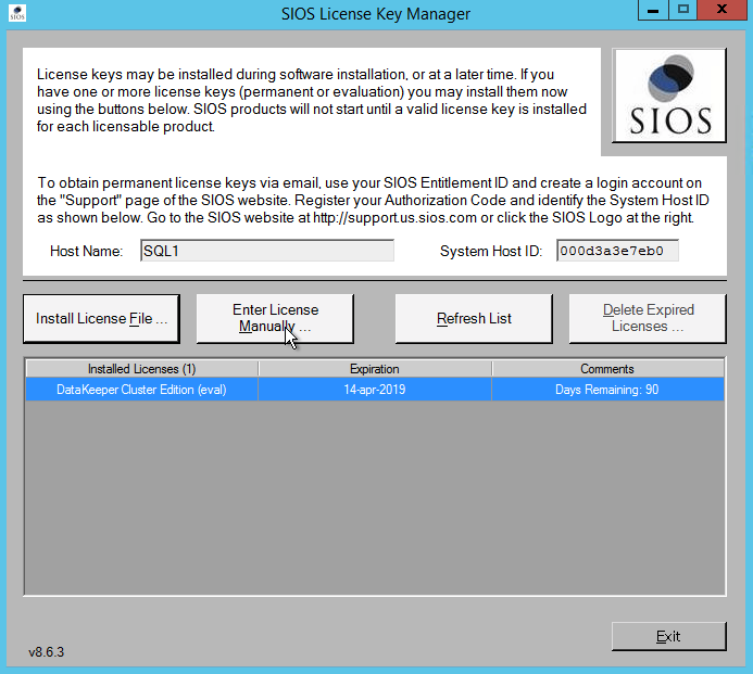 When presented with the SIOS License Key manager you can browse out to your temporary key, or if you have a permanent key you can copy the System Host ID and use that to request your permanent license. If you ever need to refresh a key the SIOS License Key Manager is a program that will be installed that you can run separately to add a new key.