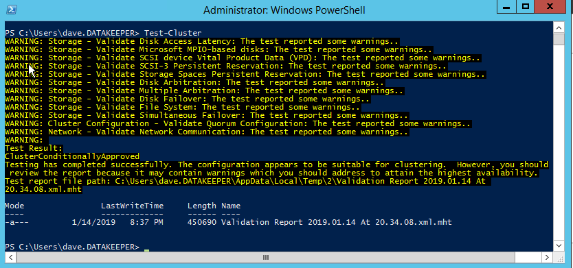 Before you continue, run cluster validation one more time. The Cluster Validation report should return just the same network and storage warnings that it did the first time you ran it. Assuming there are no new errors or warnings, your cluster is configured correctly.