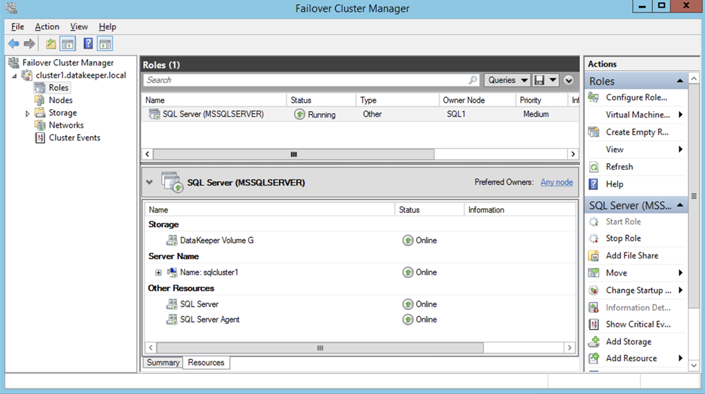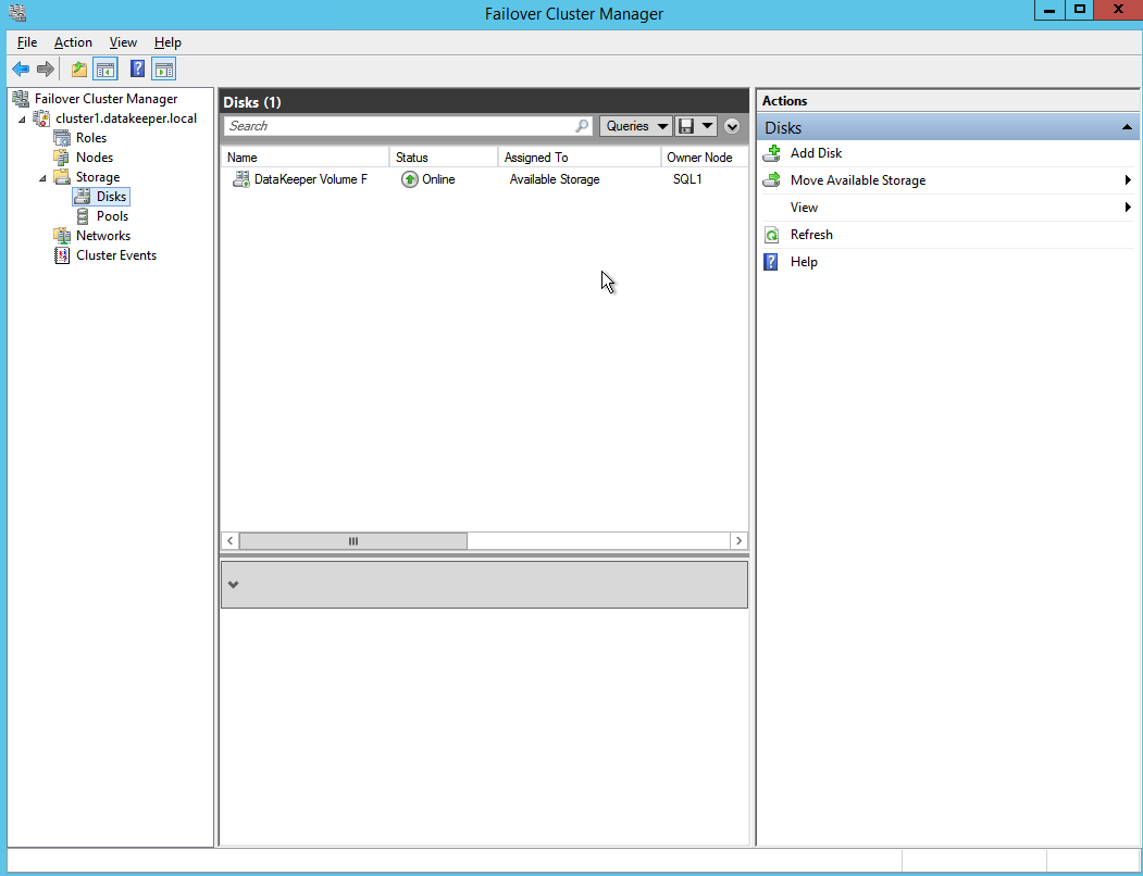 Once you complete this process open up the Failover Cluster Manager and look in Disk. You should see the DataKeeper Volume resource in Available Storage. At this point WSFC treats this as if it were a normal cluster disk resource.