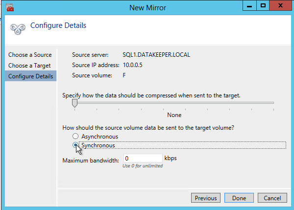 After you choose a Source and Target you are presented with the following options. For a local target in the same region the only thing you need to select is Synchronous.