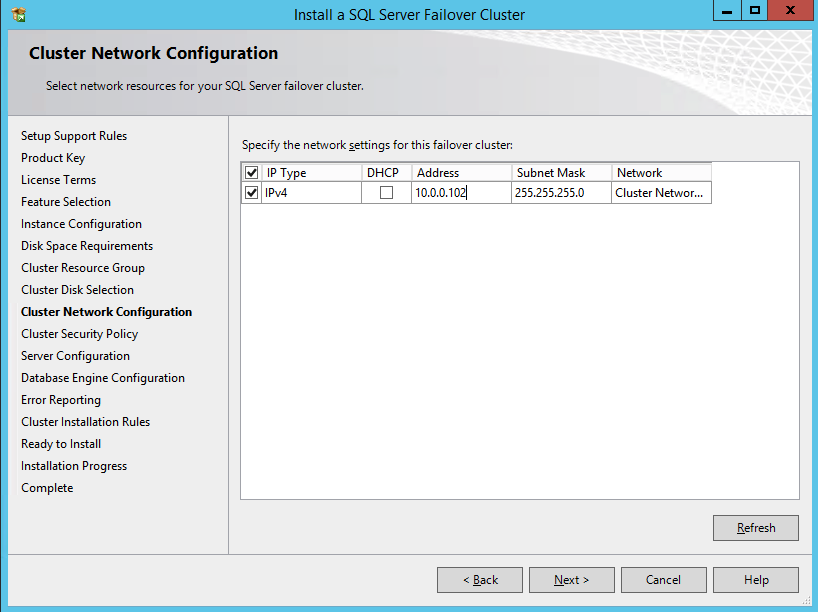 In fact, in this very installation I ran into some strange issues in terms of my SQL Server TCP/IP Properties in SQL Server Configuration Manager. When I looked at the properties I did not see the SQL Server Cluster IP address as one of the addresses it was listening on, so I had to add it manually. I’m not sure if that was an anomaly, but it certainly was an issue I had to resolve before I could connect to the cluster from a remote client.