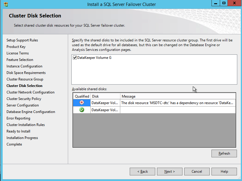 The second issue occurs anytime you add another DataKeeper Volume Resource to a SQL Cluster after the cluster is created. You must go into the properties of the SQL Server cluster resource and make it dependent on the new DataKeeper Volume resource you added. This is true for the TempDB volume and any other volumes you may decide to add after the cluster is created.