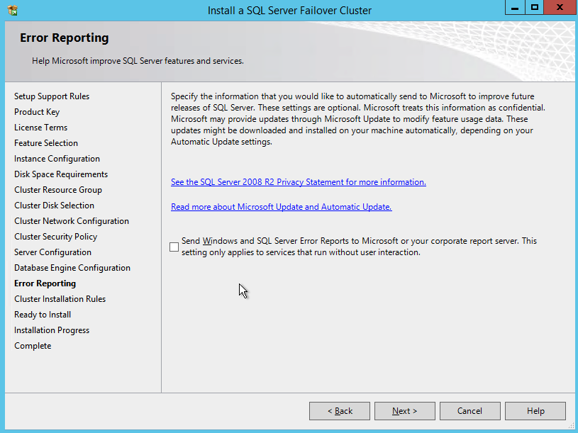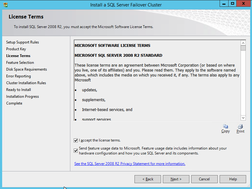 You must enable both Failover Clustering and .Net 3.5 on each instance of the two cluster instances. When you enable Failover Clustering, also be sure to enable the optional “Failover Cluster Automation Server” as it is required for a SQL Server 2008 R2 cluster in Windows Server 2012 R2.