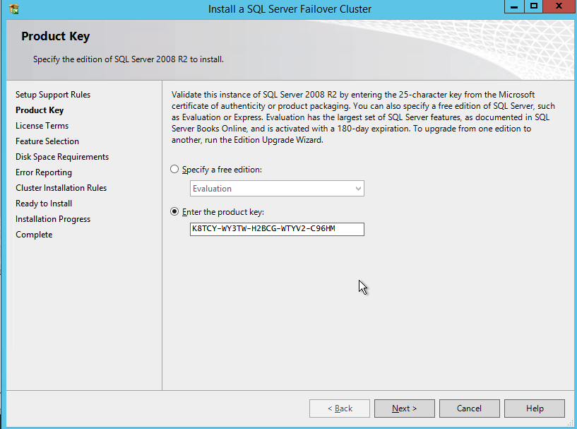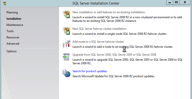 Using the SQL Server 2008 R2 media with SP3 slipstreamed, run setup and install the first node of the cluster as shown below.