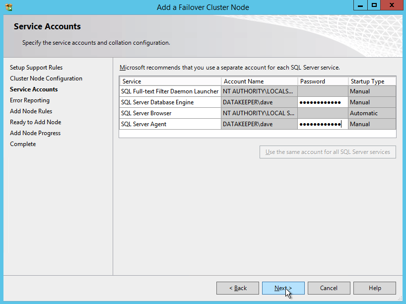The account you specify below must be a domain account and must be part of the Local Administrators group on each of the cluster nodes.