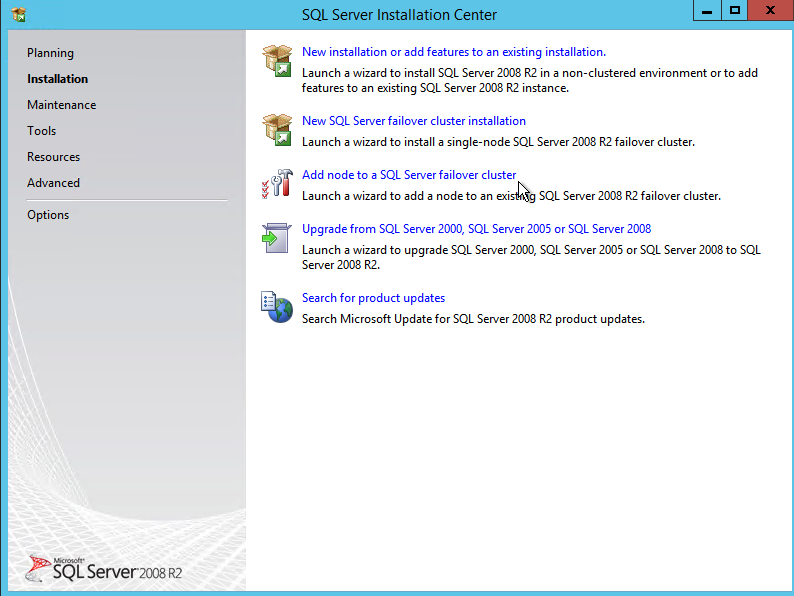 One the second node, run the SQL Server 2008 R2 with SP3 install and select Add Node to a SQL Server FCI.