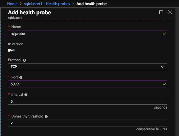 Here we configure the Health Probe. Most Azure documentation has us using port 59999, so we will stick with that port for our configuration.