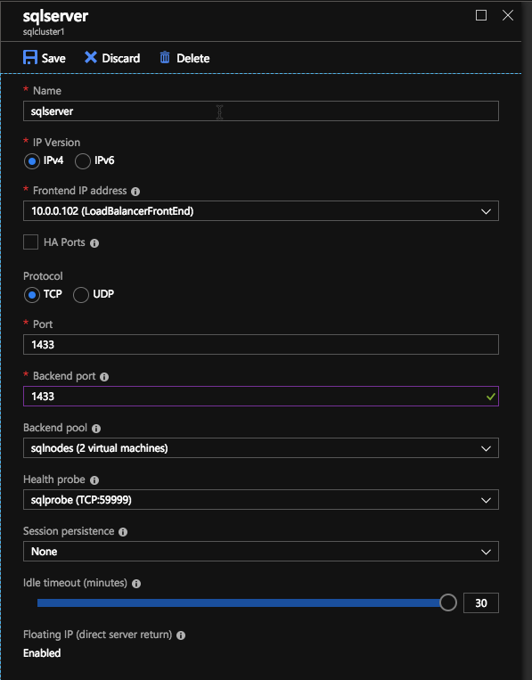 Here we will add a load balancing rule. In our case we want to redirect all SQL Server traffic to TCP port 1433 of the active node. It is also important that you select Floating IP (Direct Server Return) as Enabled.