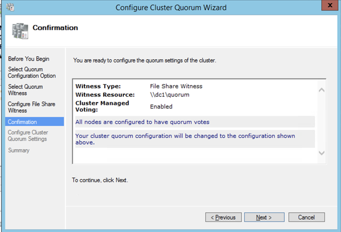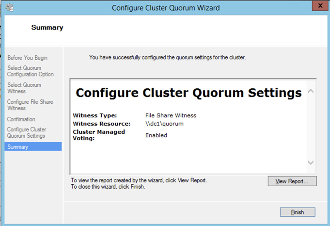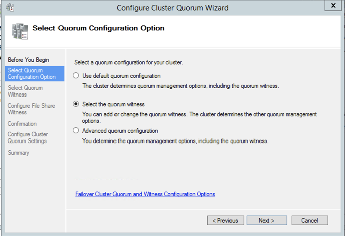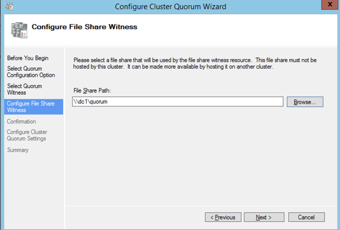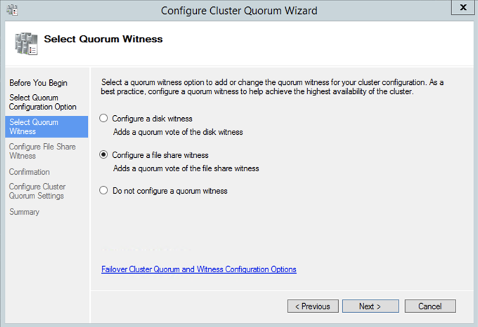 Once the share is created, you can use the Configure Cluster Quorum Wizard as shown below to configure the File Share Witness.