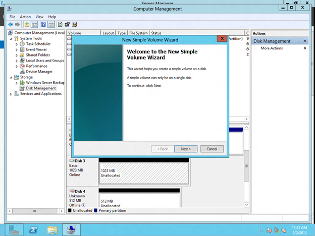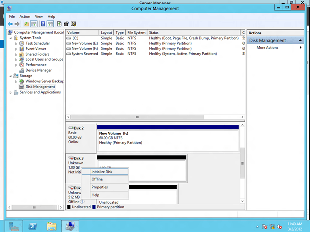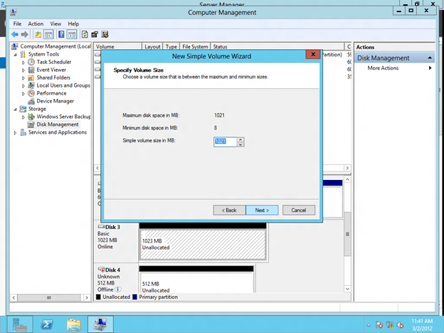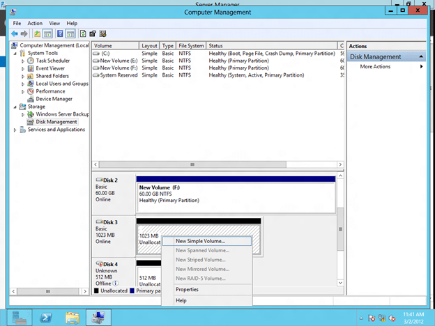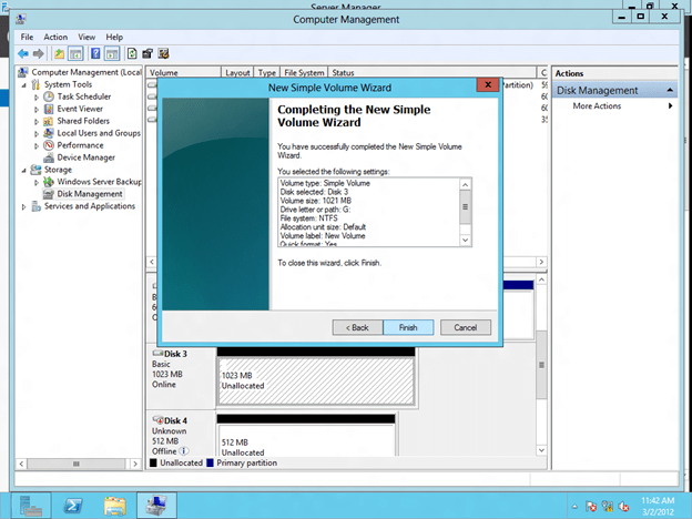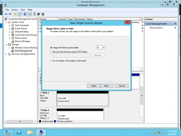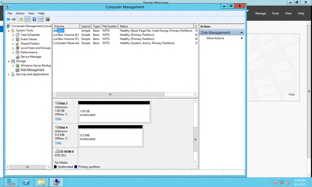 Because a SANLess Hyper-V cluster requires one VM per volume, you will want to make sure you have your storage partitioned so that you have enough volumes for each VM. The storage on each cluster node should be configured identically in terms of drive letters and partition sizes. Once you have the partitions configured properly and your VM resides on the partition you want to replicate, open the DataKeeper interface and walk through the three step wizard to create the DataKeeper Volume Resources as shown in below.