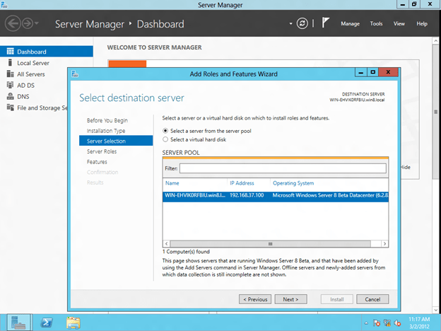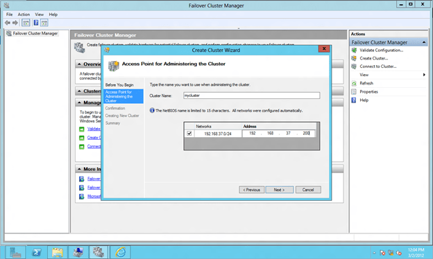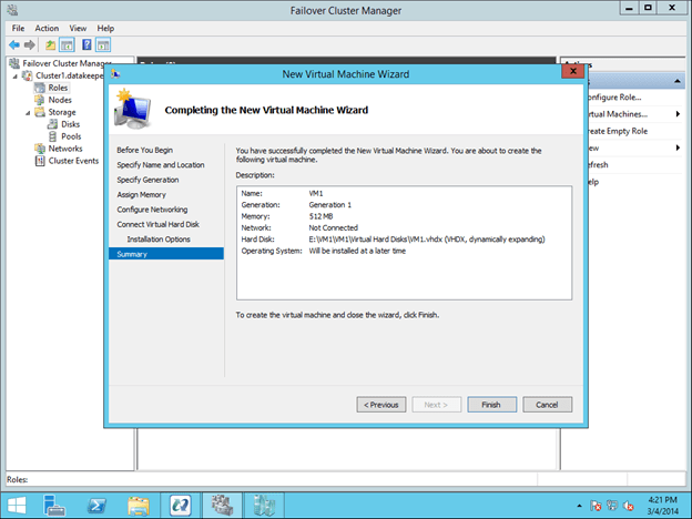 Follow through with the steps of the wizard and select the options that you want to use for the VM. When choosing where to place the VM, select the cluster node that currently is the owner of Available Storage, which will also be the source of the mirror.