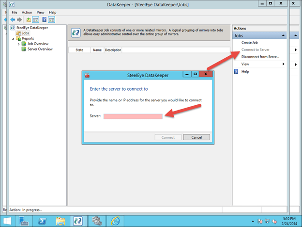First, open the DataKeeper interface and click on Connect to Server. Do this twice to connect to both servers.